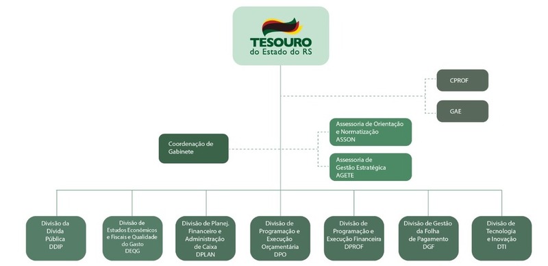A estrutura do Tesouro do Estado é formada, em primeiro nível, por sete divisões e duas assessorias, além da Chefia de Gabinete.