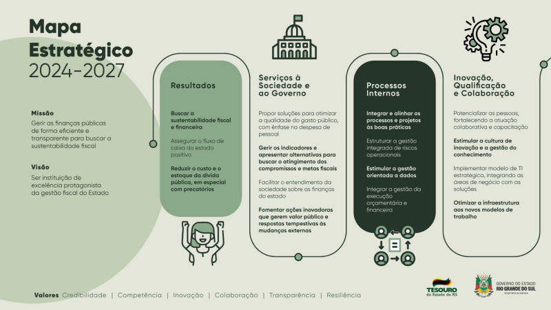 O documento apresenta de forma visual os objetivos estratégicos do Tesouro do Estado sob quatro perspectivas: “Resultados”, “Serviços à sociedade e ao governo”, “Processos internos” e “Inovação, qualificação e colaboração”. Com isso, reforçamos nossa missão de gerir as finanças públicas de forma eficiente e transparente para buscar a sustentabilidade fiscal em um documento que fornece uma visão integrada, em que cada perspectiva representa um aspecto diferente, mas todas estão conectadas e são fundamentais para o sucesso geral da gestão fiscal do Estado.
