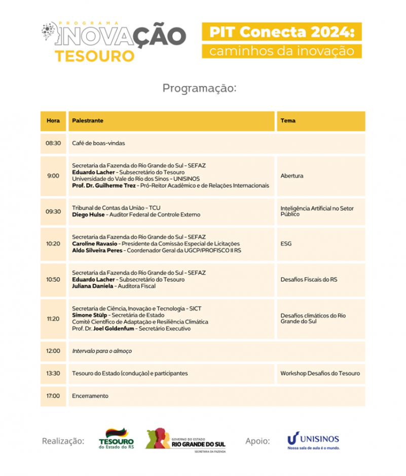 O evento "PIT Conecta 2024: Caminhos da Inovação", realizado em 6 de novembro de 2024 na Unisinos, reuniu mais de 100 participantes, incluindo gestores públicos, pesquisadores e acadêmicos, para discutir inteligência artificial, ESG, desafios climáticos e sustentabilidade. O Subsecretário do Tesouro, Eduardo Lacher, destacou a importância da inovação aberta e da parceria com a academia, enquanto o auditor Diego Hulse, do TCU, apresentou o uso de IA para aumentar a eficiência no exame de mais de 100 mil atos anuais em órgãos federais. A Secretária de Ciência, Inovação e Tecnologia, Simone Stülp, destacou a consulta pública para a Política Estadual de Inovação 2025-2030, reforçando a inovação como eixo estratégico para o desenvolvimento do Estado.